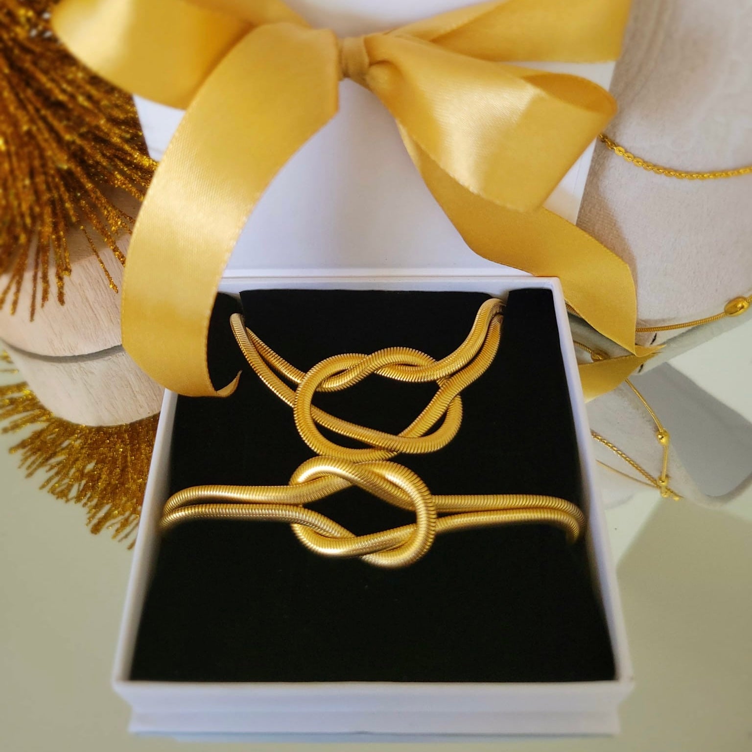 - Modern gold set with an interlaced design.